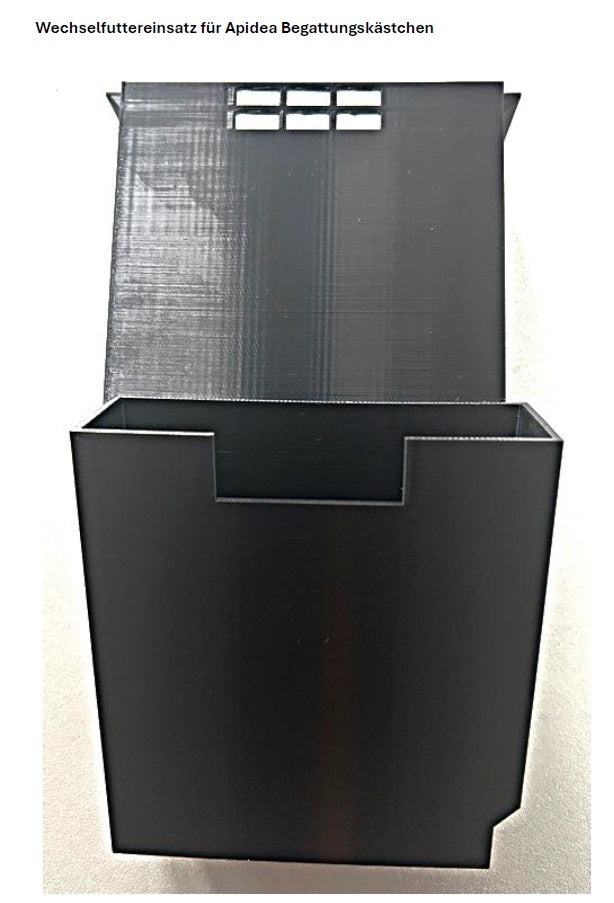 Herkömmliche Futtertaschen aus Styropor sind schwer zu reinigen und neigen dazu, sich mit Rückständen und Schimmel zu belegen. Unser Wechselfuttereinsatz für Apidea Begattungskästchen schafft hier Abhilfe. Er lässt sich schnell entnehmen und ganz bequem in der Spülmaschine säubern. Dadurch entfällt das mühsame Auskratzen und Abspülen – was sowohl Zeit als auch Nerven spart.